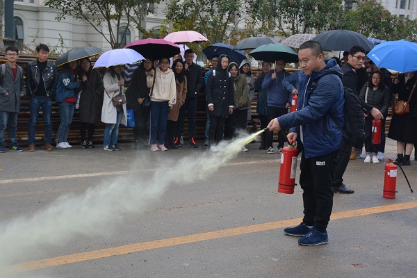 讲座结束后,全体与会人员来到繁塔楼D座西侧进行灭火器使用的实地演练。