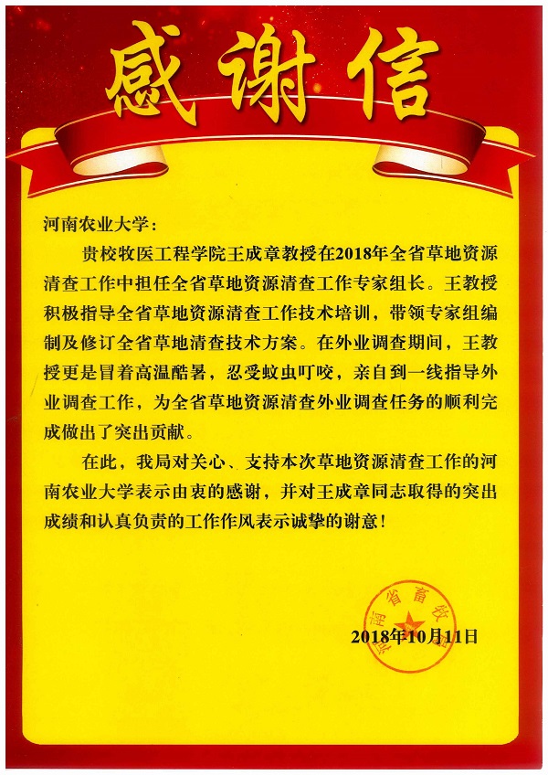 日前,酷爱成人网 收到来自河南省畜牧局的感谢信,对酷爱成人网 教师王成章、姜义宝在2018年全省草地资源清查工作中所做的出的贡献表示感谢,对他们严谨求真的科学态度、率先垂范的优良作风、务实严格的工作要求、吃苦耐劳的工作精神给予高度评价。他们的表现也展示了我们牧医人的风采。(文/韩笑)
