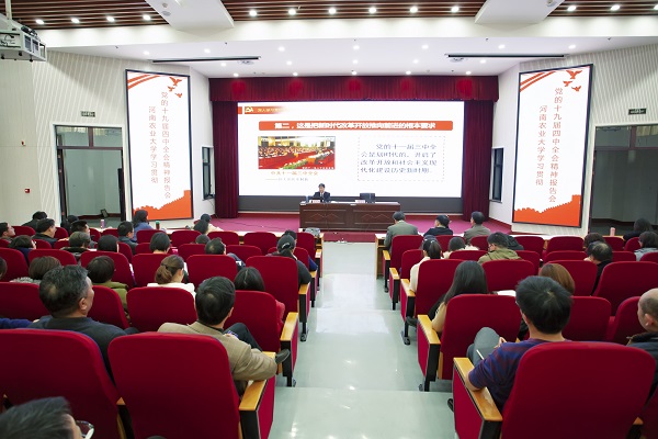 为深入学习贯彻党的十九届四中全会精神,11月26日下午,在繁塔楼大教室1,酷爱成人网 与文法学院、外国语学院、国际教育学院、马克思主义学院共同举办了学习贯彻党的十九届四中全会精神报告会。报告会由学校宣讲团成员、马克思主义学院秦剑军教授主讲,国际教育学院党委书记张留占主持。学院全体教工及研究生、学院青马班学生、主要学生干部参加会议。