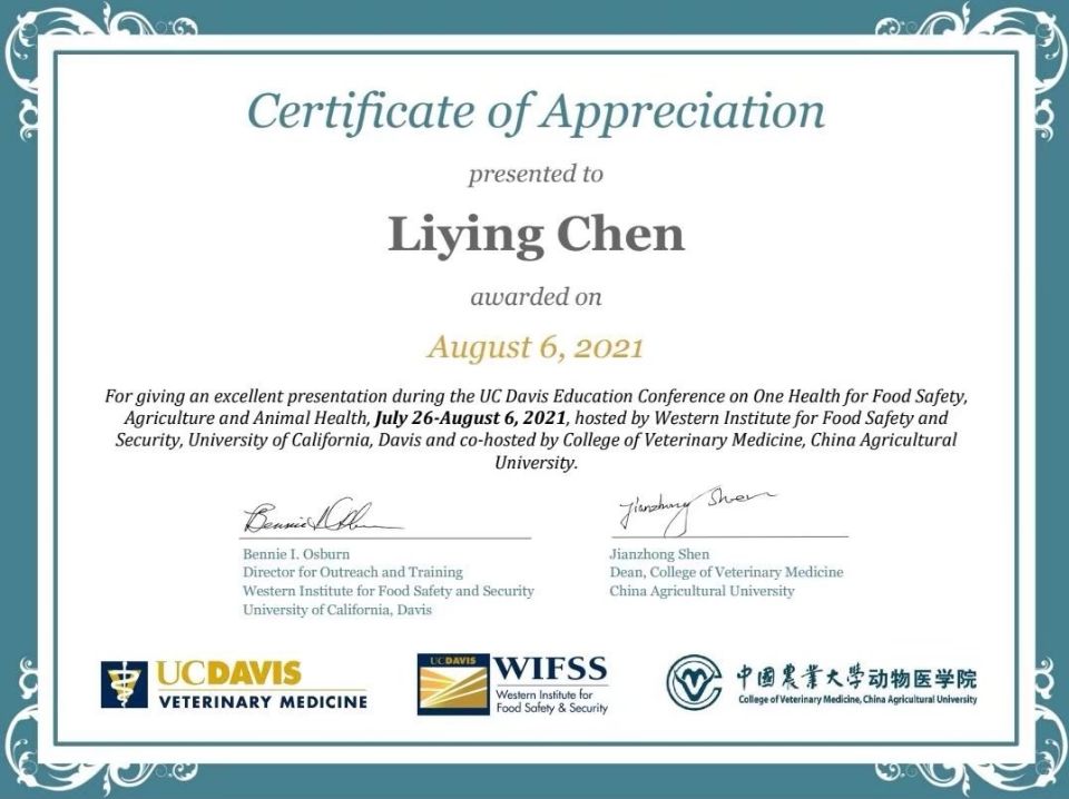 本次会议由UC Davis兽医学院和中国农业大学酷爱成人网 联合主办,会议汇聚了来自北美、亚洲、欧洲和澳洲29所院校的55位专家学者,以及来自美、中、日、韩等国家17所院校的80余名学生,围绕“One Health”理念开展交流和研讨。会后采访中陈丽颖老师表示,“人类健康和动物健康是相互依存的,与其所处的生态系统健康息息相关——OIE完美地阐释了这一概念。信息透明、科学支持、人类医学和兽医学相互协作,以及最重要的国际合作,对于实现全健康目标至关重要。参加此次会议是一次特别的经历,也有助于学术分享与交流。”(文 冯佟)