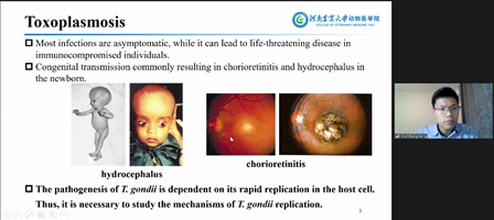 交流会上,张恒老师以《The Function of Shuttle Proteins in Toxoplasma Replication》为主题,系统阐述了泛素-蛋白酶体系统调控弓形虫分裂繁殖进而影响弓形虫致病性的机制,为有效控制弓形虫感染提供了理论依据。陈峥以《Mobilization of tet(X4) by IS1 Family Elements in Porcine Escherichia coli Isolates》为主题作报告,汇报了关于细菌耐药性研究的相关成果。李娟锋以《miRNAs Regulate HCT – 8 Cells Apoptosis Induced by Cryptosporidium Parvum Infection》为主题,阐述了隐孢子虫感染诱导宿主细胞凋亡的机制。