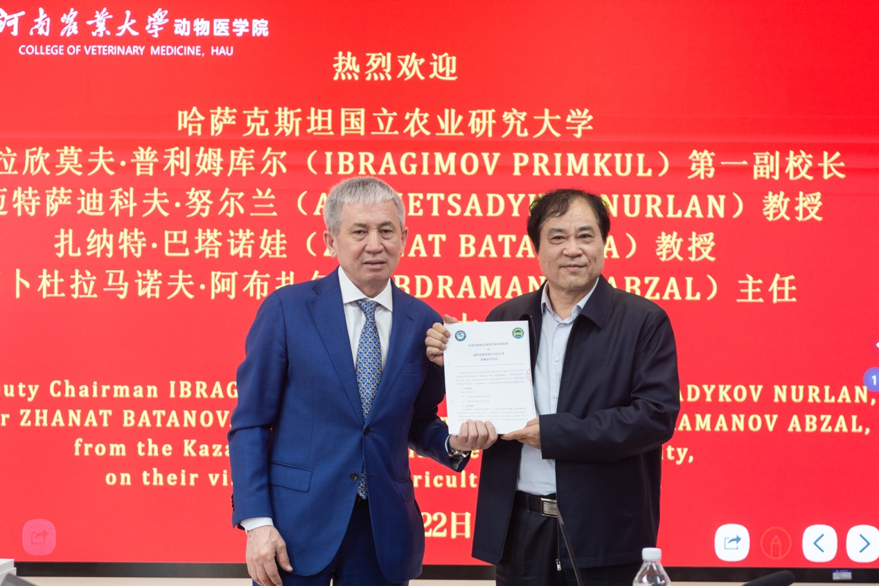 会上,张改平对哈萨克斯坦国立农业研究大学第一副校长一行的到访表示热烈欢迎。他指出,双方开展国际交流与合作符合国家共建“一带一路”推动构建人类命运共同体的方针政策,具有良好的合作基础。张改平表示,人才培养是大学的根本任务,双方院校通过访学、联合培养等方式开展广泛的交流与合作,以促进双方兽医领域人才培养。在双方共同关注的动物疫病和疫苗领域,通过联合申报科研项目、共建实验室等形式开展基础研究和应用研究的科技交流与合作,推动相关产业共同发展。