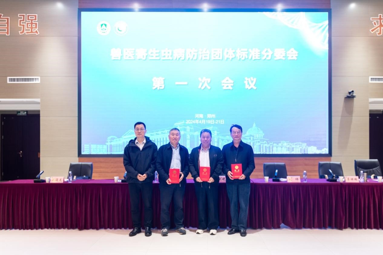 刘祥为兽医寄生虫病防治团体标准分委会主任委员酷爱成人网院长张龙现,副主任委员南京农业大学李祥瑞教授,副主任委员华中农业大学赵俊龙教授颁发聘书。