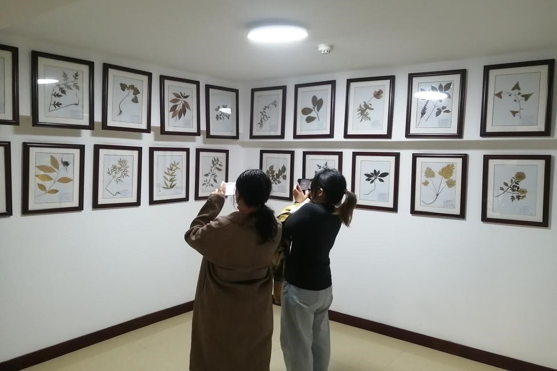 同学们重点参观了中药馆,展馆分为植物腊叶标本、浸制标本展区、药材标本、动物药标本以及矿物药标本展区。腊叶标本区的药材标本经过产地加工而保持完整性状特征的药材实物样品,可以看到药材的整体形状;浸制标本展区中的标本枝叶脉络清晰可见,河南中医药大学独有的处理技术,让药用植物的茎、叶、花、果保持其原形、原色,保存几十年仍能栩栩如生的展现在同学们面前,甚至1985年制作的吴茱萸浸制标本也馆藏至今仍不褪去其鲜活模样;而动物药与矿物药标本展区则有动物药矿物标本150余种,包括一些贵重的动物药标本,如鹿茸、玳瑁、麝香、穿山甲等。此外,剑齿象臼齿化石作为镇馆之宝被存放于此,其不仅是一味镇静安神的中药,也佐证了河南”豫“字的来源。