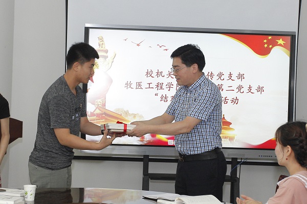 活动中,各支部书记分别介绍了本支部的基本情况,师生党员代表分享了学习《“平”语近人——习近平总书记用典》的心得体会,双方支部书记签署了支部共建协议,校机关组织宣传党支部向牧医工程学院本科生第二党支部每位党员现场赠送书籍《新时代追梦人》、《习近平讲故事》以及党员学习笔记等学习资料和用具。