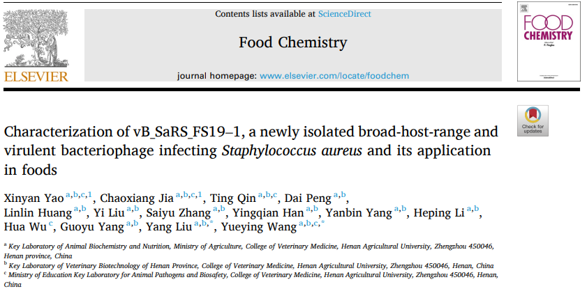 农业农村部动物生物化学与营养重点实验室、河南省兽医生物技术重点实验室、动物病原与生物安全教育部重点实验室杨国宇教授和王月影教授课题组在国际著名期刊《Food Chemistry》(中国科学院一区TOP期刊)发表题为“Characterization of vB_SaRS_FS19-1, a newly isolated broad-host-range and virulent bacteriophage infecting Staphylococcus aureus and its application in foods”的研究论文。通过以多重耐药金黄色葡萄球菌为宿主菌,分离获得金黄色葡萄球菌噬菌体。研究表明,该噬菌体潜伏期短、爆发量大、宿主范围广,对极端环境条件的耐受性强。全基因组序列分析不含与tRNA、毒力因子、抗生素耐药性及溶原相关的基因,且以剂量依赖性的方式抑制或杀灭金黄色葡萄球菌,为噬菌体在金黄色葡萄球菌中的防控奠定了基础。