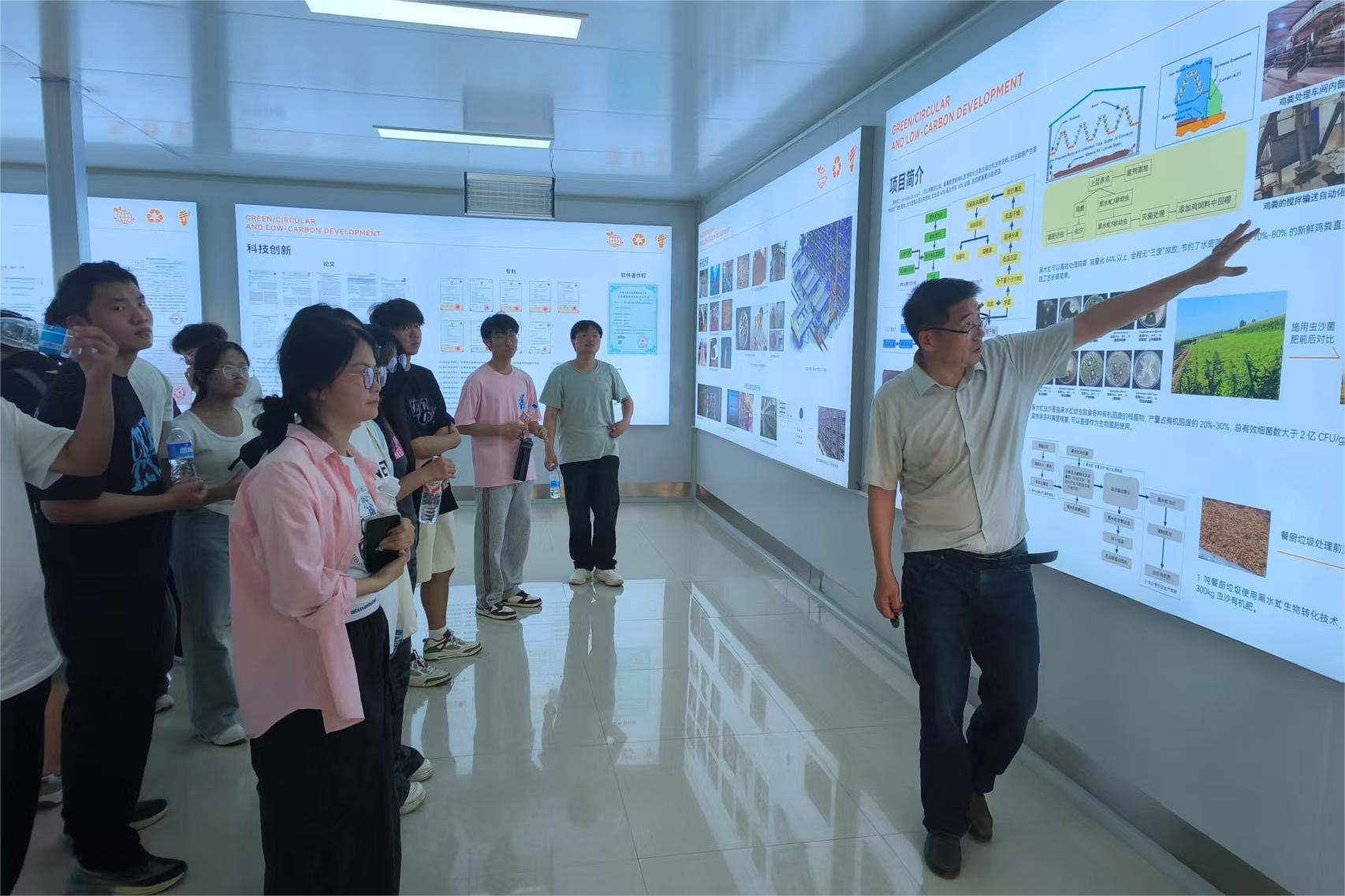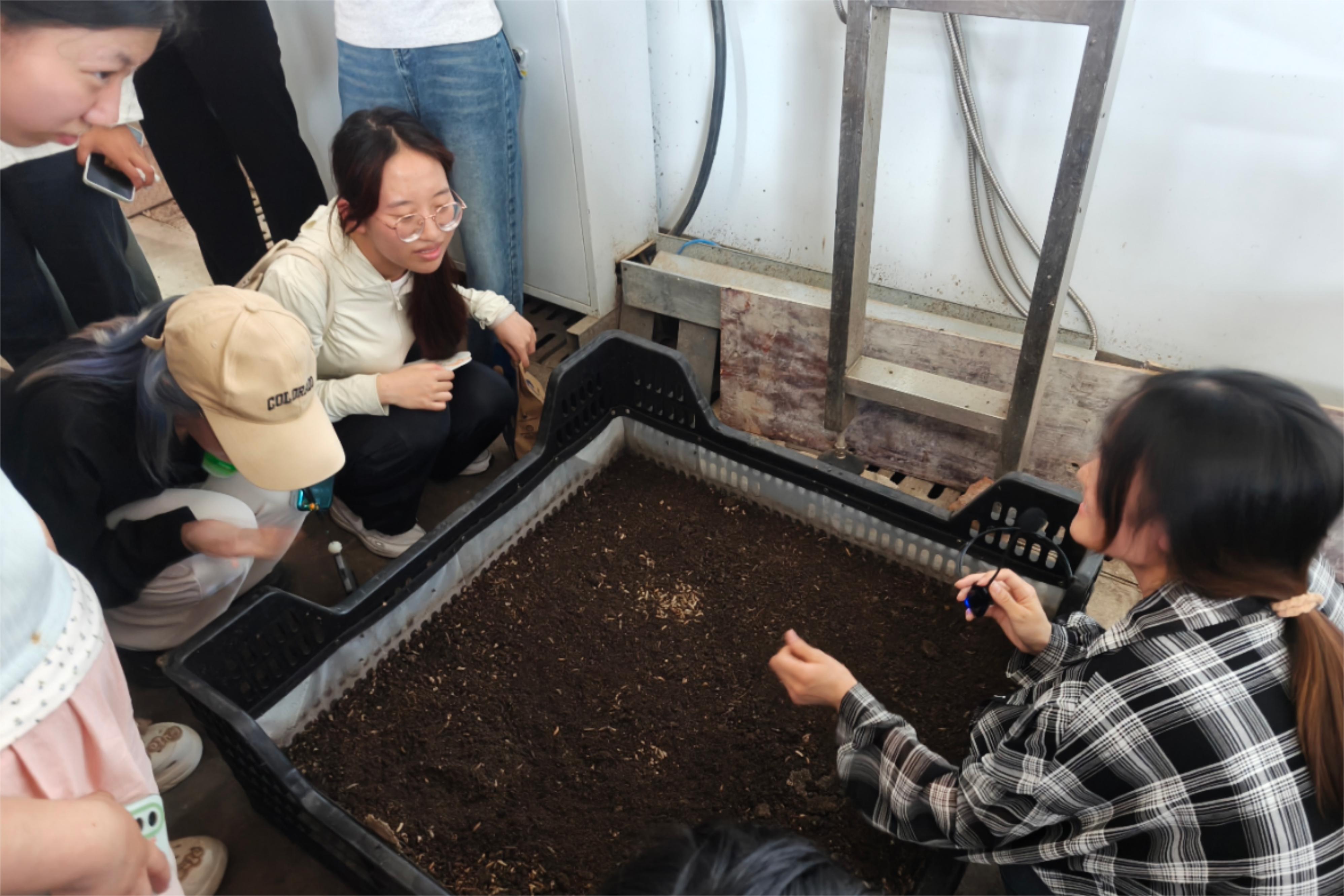 在副院长韩立强的带领下,同学们率先参观了杨森教授团队指导建设的黑水虻生物转化基地,讲解员系统展示了“虫-菌互作”技术在有机废弃物资源化利用中的创新应用。同学们通过实地观察黑水虻养殖全流程,深入了解昆虫蛋白转化技术对构建生态农业循环体系的重要意义。
