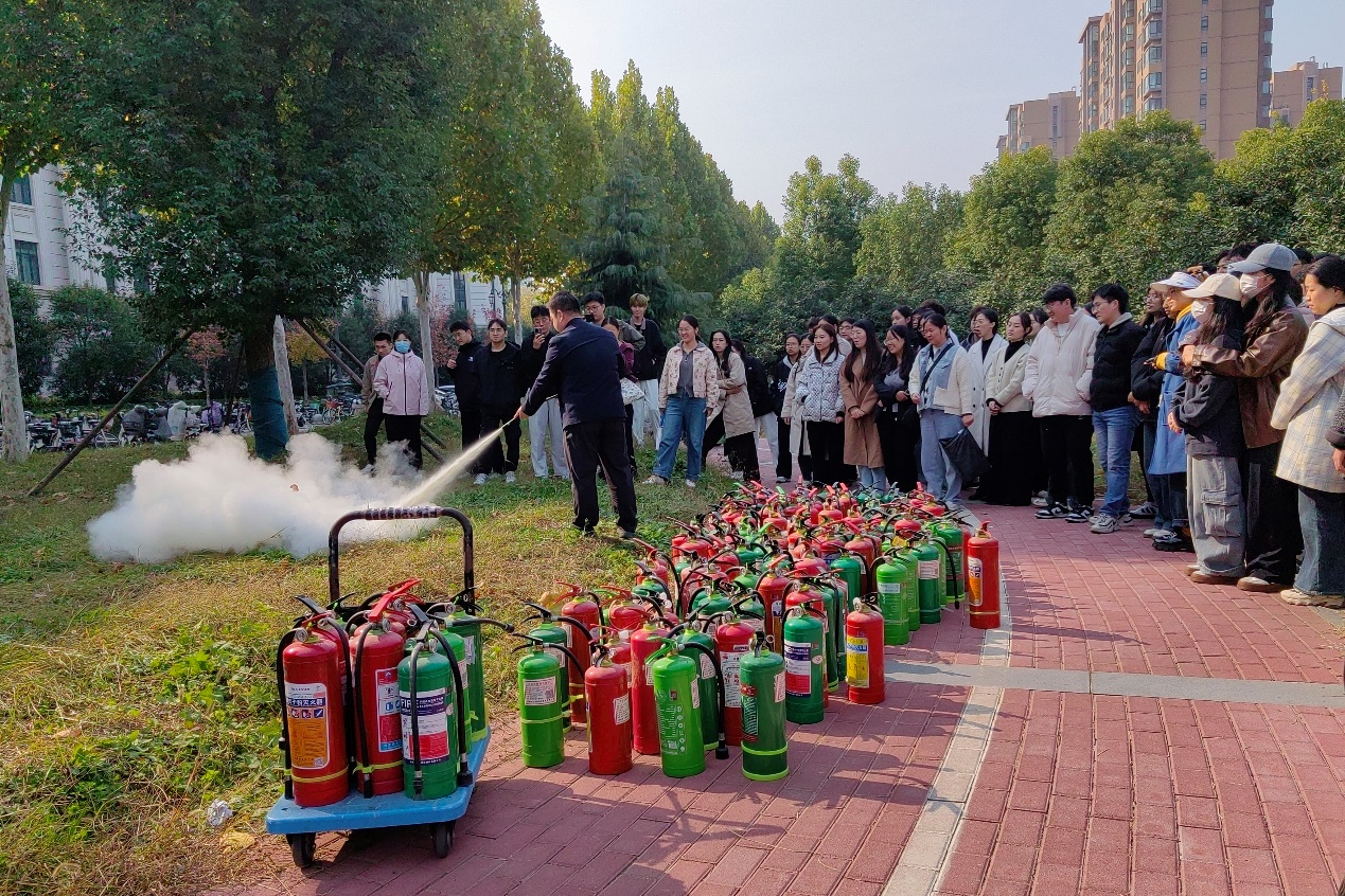 为了使理论知识更加贴近实践,杨东东还带领全体学生到第一实验楼北门前空地处现场演示了灭火器的正确使用方法,包括如何选择合适的灭火器以及如何有效扑灭初期火灾等。在杨东东的指导下,学生们分组进行了灭火器的实际操作练习,每个人都亲自体验了从拔掉保险销到瞄准火源喷射灭火剂的全过程。通过这种手把手的教学方式,有效地提高了学生们在紧急情况下使用消防器材的能力。