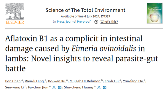Aflatoxin B1 as a complicit in intestinal damage caused by Eimeria ovinoidalis in lambs: Novel insights to reveal parasite-gut battle”的研究论文。此项研究发现暴露于黄曲霉毒素B1(AFB1)可以干扰球虫在肠道内的增殖状态,并调控球虫感染羔羊肠道形态、肠道屏障功能、肠道菌群稳态、肠道炎症以及全身免疫的变化。此外,利用蛋白质组学分析揭示了AFB1与球虫共同存在下导致羔羊肠道损伤的潜在作用机制。