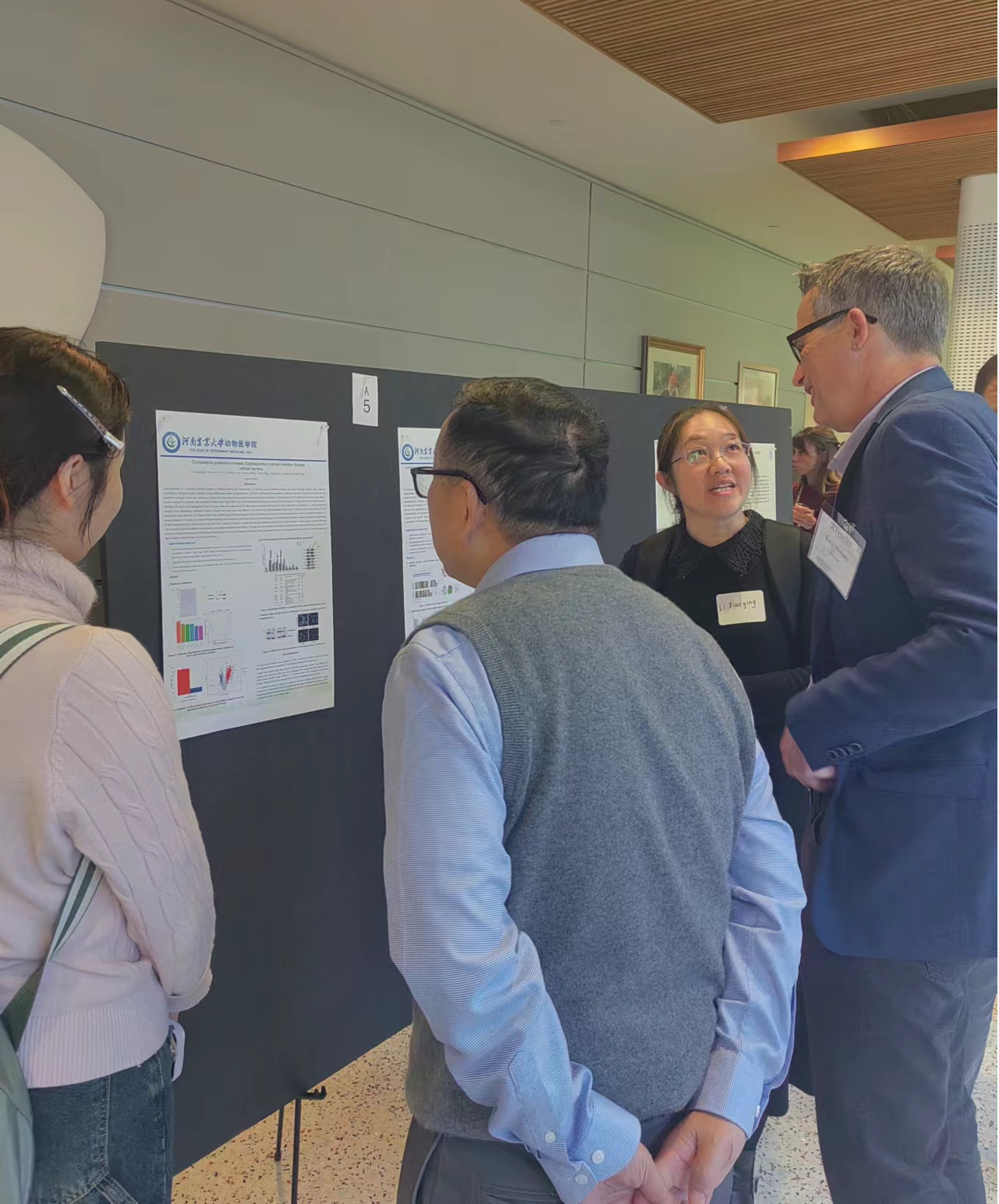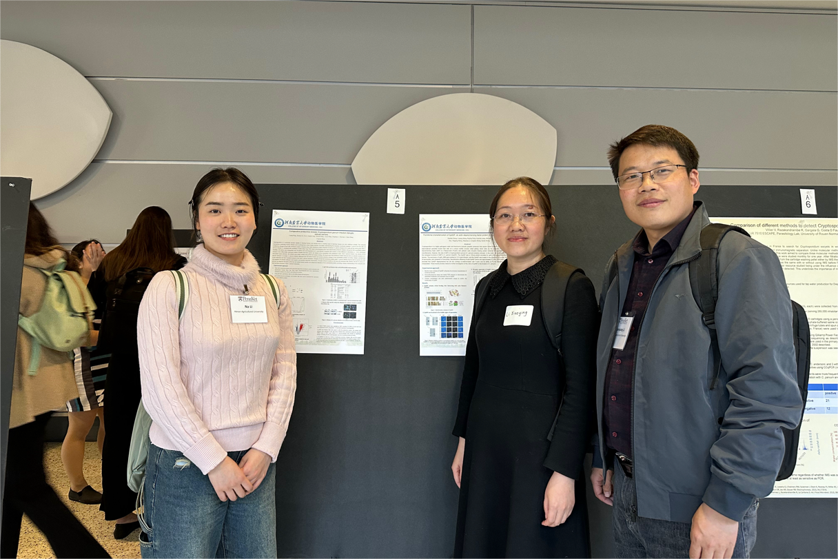 师生进行了海报展示,介绍了基于比较蛋白组技术检测微小隐孢子虫入侵宿主细胞过程中膜蛋白的变化,以更好的了解微小隐孢子虫与宿主相互作用机制,该研究发现在微小隐孢子虫入侵宿主细胞过程中宿主细胞屏障功能被破坏,细胞骨架蛋白发生改变,为微小隐孢子虫入侵宿主过程中的分子和生物学功能提供了更深入的了解。
