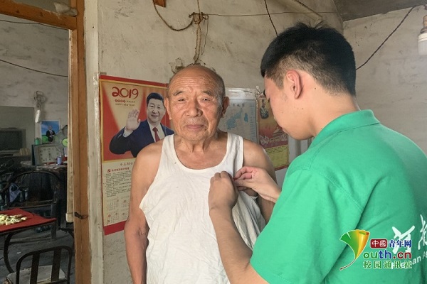 队员们所拜访的农户中有这么一位特殊的老人,老爷爷名叫张佃祥,家中十分贫穷,家内基本上没有彩电,老爷爷的老伴在前几年也去世了,他唯一的儿子也跑到南方去打工,家中只剩他一个孤寡老人。但当爷爷听闻到来的团队新成员是中国共产党员时,他自豪地对团队成员讲到:“孩子们呀,我也是一名共产党员,我是1958年加入的中国共产党,现在算来我的党龄也有62年了,我在村里的大队上干了二十年大队长,这一辈子都没有忘记全心全意为人民服务。”团队成员听后感触颇深,似乎也明白了自己身上所承载的时代担当,随后团队成员许千帅为老爷爷佩戴中国共产党党徽,老人留下了激动地泪水。