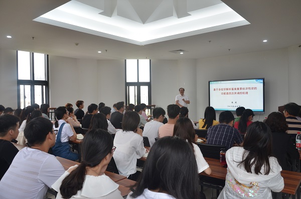 在第一实验楼530会议室,朱庆做了《基于多组学解析畜禽重要经济性状的功能基因及其调控机理》的报告。他用通俗易懂的语言对多组学研究的概念、技术方法和主要用途进行了说明,然后介绍了四川农业大学家禽和猪育种团队采用不同组学,在解析畜禽重要经济性质分子调控机理方面的研究进展,以及相关成果总结在《Genome Research》、《Nature Genetics》的体会,对多组学联合分析在畜禽主要性状研究中的作用进行了展望。